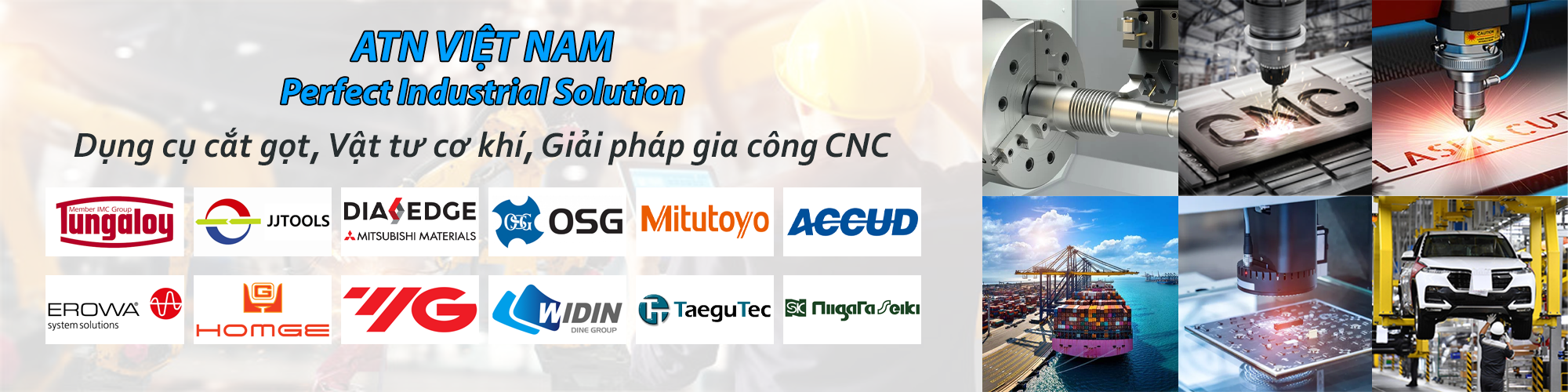 ATN hiện là đối tác tin cậy của nhiều thương hiệu hàng đầu thế giới về dụng cụ gia công như Teagutec, JJ Tools, Tungaloy, OSG, YG-1, Mitsubishi… Bên cạnh đó chúng tôi cũng là đơn vị phân phối của nhiều thương hiệu thiết bị công nghiệp như Siemens, SMC, Schneider, Schaeffler, Norgren, Parker, Festo, ABB, INA, FAG, NTN… Sự hợp tác này giúp chúng tôi cung cấp cho khách hàng những sản phẩm tiên tiến, đa dạng và đáp ứng trọn vẹn nhu cầu trong lĩnh vực gia công cơ khí chính xác và tự động hoá công nghiệp.