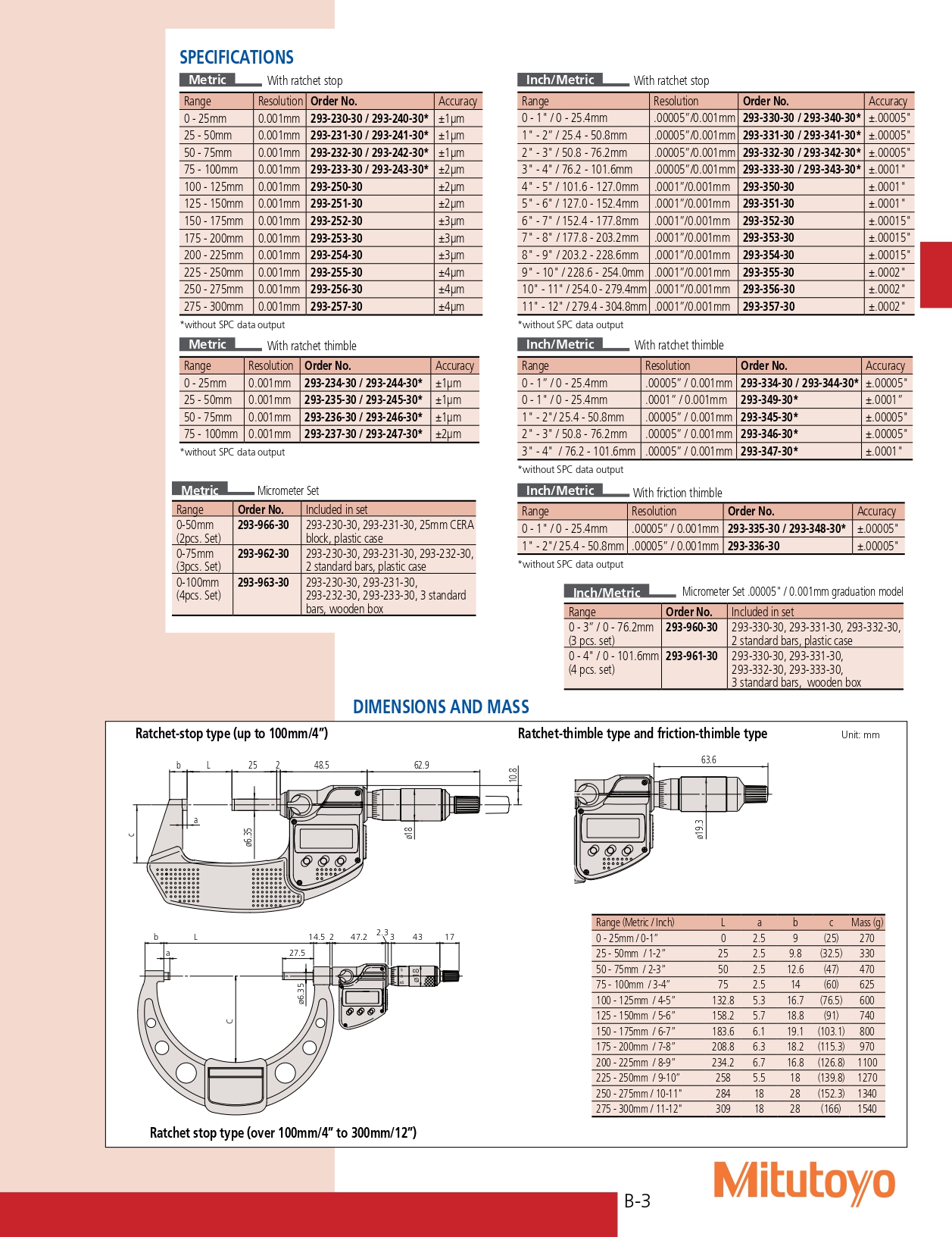 SPECIFICATIONS (Inch/Metric) With ratchet stop